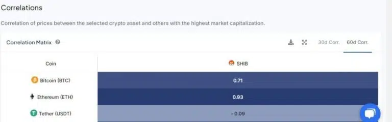 داده های پلتفرم تجزیه و تحلیل بلاک چین IntoTheBlock (ITB) نشان می دهد که Shiba Inu بیشتر با اتریوم مرتبط است تا بیت کوین. طبق گزارش ITB، شیبا دارای همبستگی 93 درصدی با قیمت اتریوم در 60 روز گذشته است. با این حال، همبستگی آن با بیت کوین در همان دوره 71 درصد است.