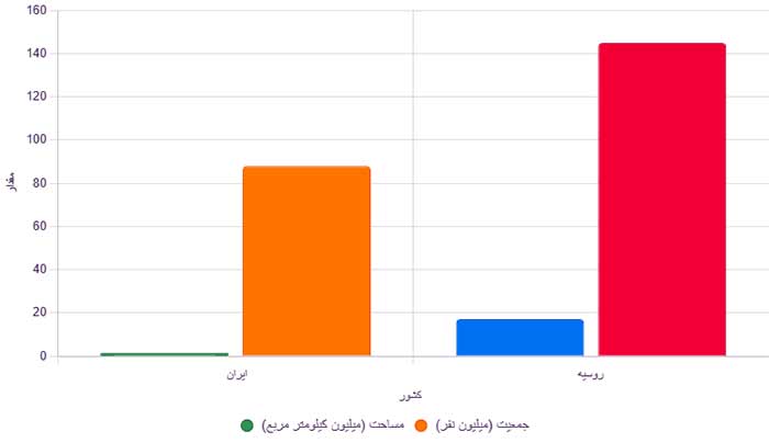 برای درک بهتر تفاوتهای ایران و روسیه، نمودار زیر جمعیت و مساحت این دو کشور را مقایسه میکند: